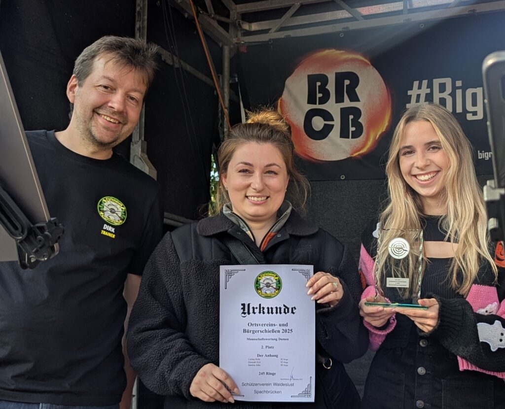 Ortsvereins- und Bürgerschießen 2025: Organisator Marcus Väth (2. v. links) ehrt das „Dream Team“ mit Jennifer Heinz, Selina Schuchmann und Christine Hummer (v.l.n.r) für den Sieg in der Mannschaftswertung der DamenOrtsvereins- und Bürgerschießen 2025: Dirk Ruiken überreicht den Pokal für den zweiten Platz an die Mannschaft „Der Anhang“ mit Celina Rohr, Hannah Keil, Samira John.
