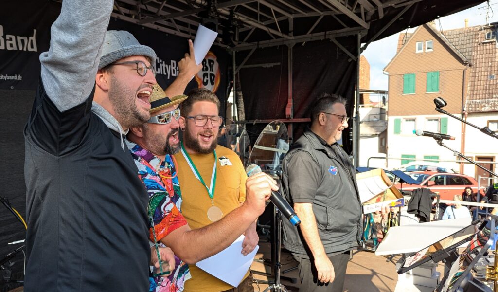 Ortsvereins- und Bürgerschießen 2025: Die „Kerbverein Spachbrücken Allstars“ mit Marvin Berg, Timo Dieter, Felix Göckel (v.l.n.r.) stimmen zum Siegeslied bei der Ehrung auf dem Kerbplatz an.
