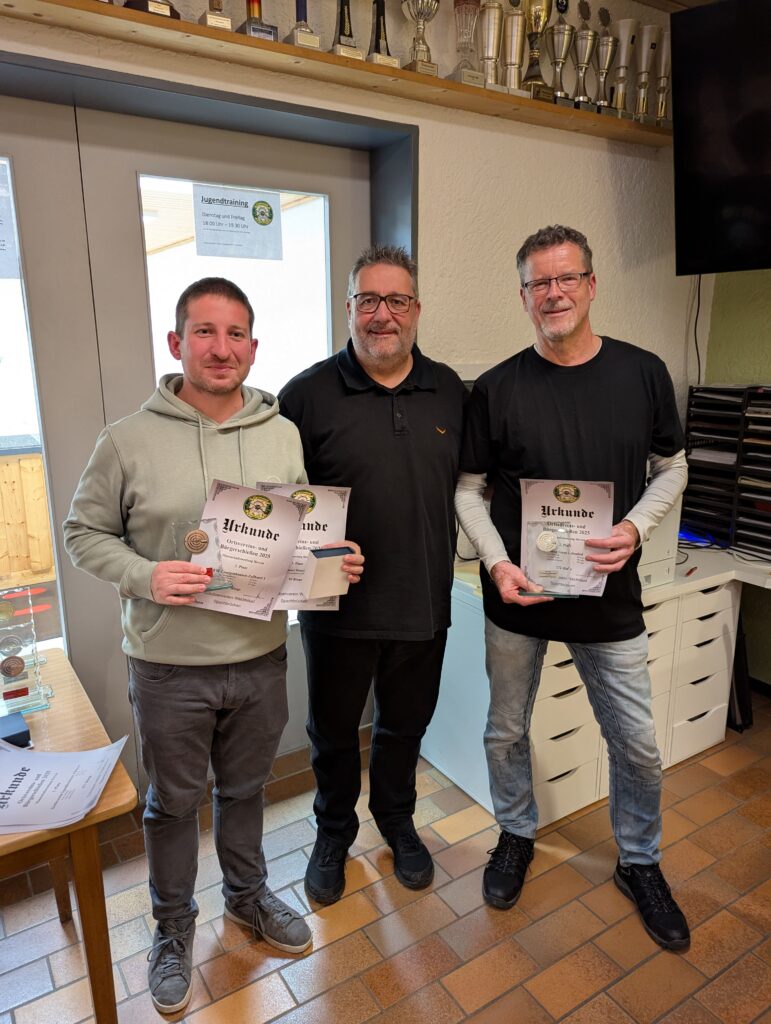 Ortsvereins- und Bürgerschießen 2025: Dritter Platz mit der Mannschaft für „Freiwillige Feuerwehr Georgenhausen-Zeilhard 1“ (links), und zweiter Platz für die „Young Guns Reloaded“ angenommen von „Trainer“ Michael Schimpf (rechts)