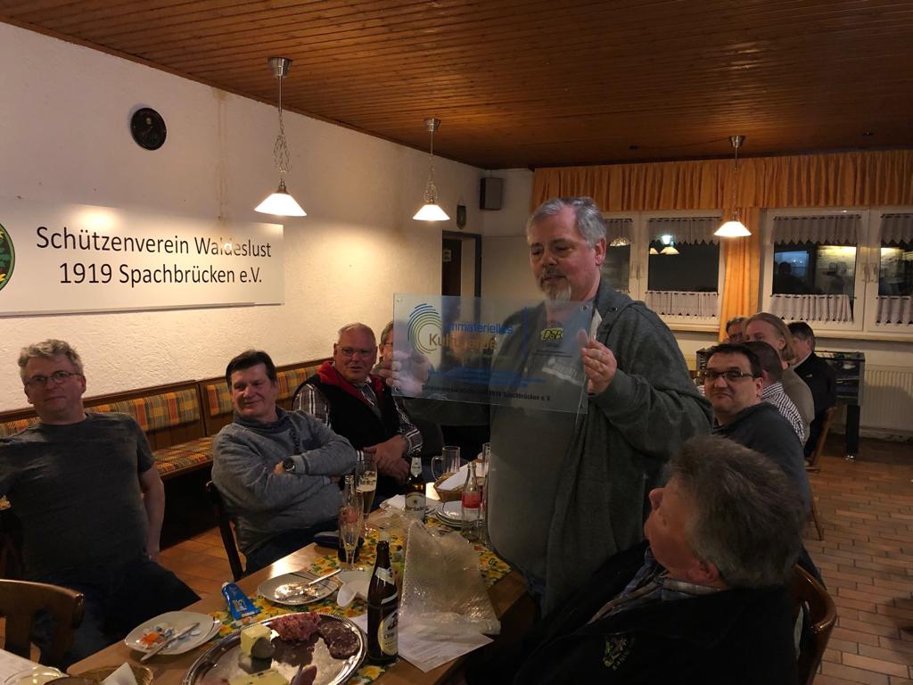 Neben Jubilaren und der Ergebnisverkündung der internen Vereinsmeisterschaft, war ein weiterer Höhepunkt vorgesehen. Ein Mitglied überreichte dem Verein ein Schild für das Vereinshaus zur Auszeichnung als immaterielles Kulturerbe des „Schützenwesens in Deutschland“. Mit dieser in Eigenregie entstandenen Geste rundete Stefan Wolter die Veranstaltung, mit einer sehr schönen Idee, gelungen ab.